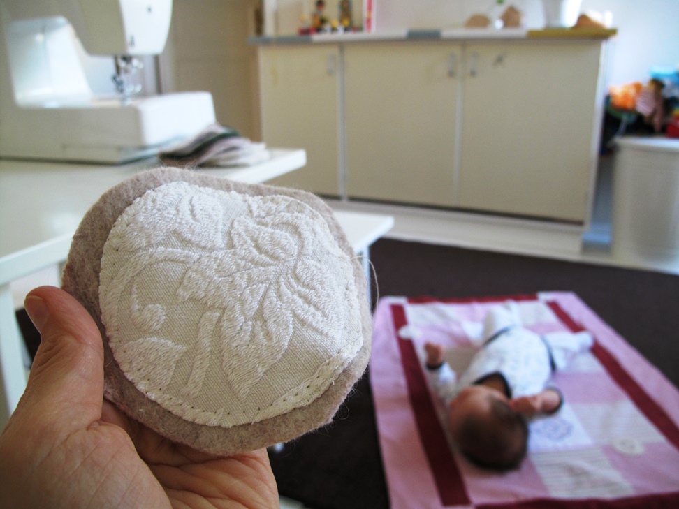 Ensin oli kokeilussa Imsevimsen vanha malli, mutta enhän minä raaskinut niitä käyttää, kun tuntui, että vastasyntyneen herkkä iho ihan raspaantuu niistä olivat karheita ja kuorivaipan kanssa kankeitakin. Tuntui, ettei hän taivu liikkumaan. Tomera serkkunsa on kyllä urheasti pitänyt niitä ja hyvin on mennyt. Perinnöksi kun saimme, niin luontoon otti luovuttaa ja koitin jopa muokata niitä ompelemalla niihin omia virityksiä lisäksi, mutta ei!