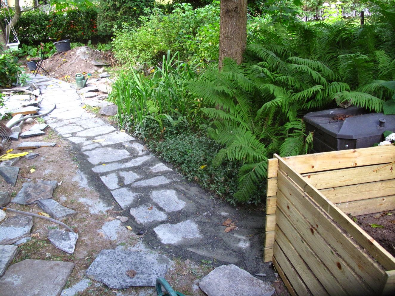 kasvillisuuden (!!), jonka sittemmin rajasin mukulakivin. Minä leikkelin pohjakankaan paikoilleen ja piirsin polun linjat. Hän kantoi tonnikaupalla sitä pohjustushiekkaa 5 cm kerrokseksi.